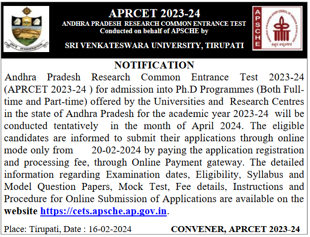 Sri Venkateswara University, Tirupati, is conducting the Andhra Pradesh Research Common Entrance test ( APRCET ) for admission into PhD (Full-time / Part-time) and M.Phil. (Part-time/Part-time) research courses in 14 Universities, campus colleges, research centers, and their affiliated colleges for the second time on behalf of APSCHE, Tadepalli, Guntur.