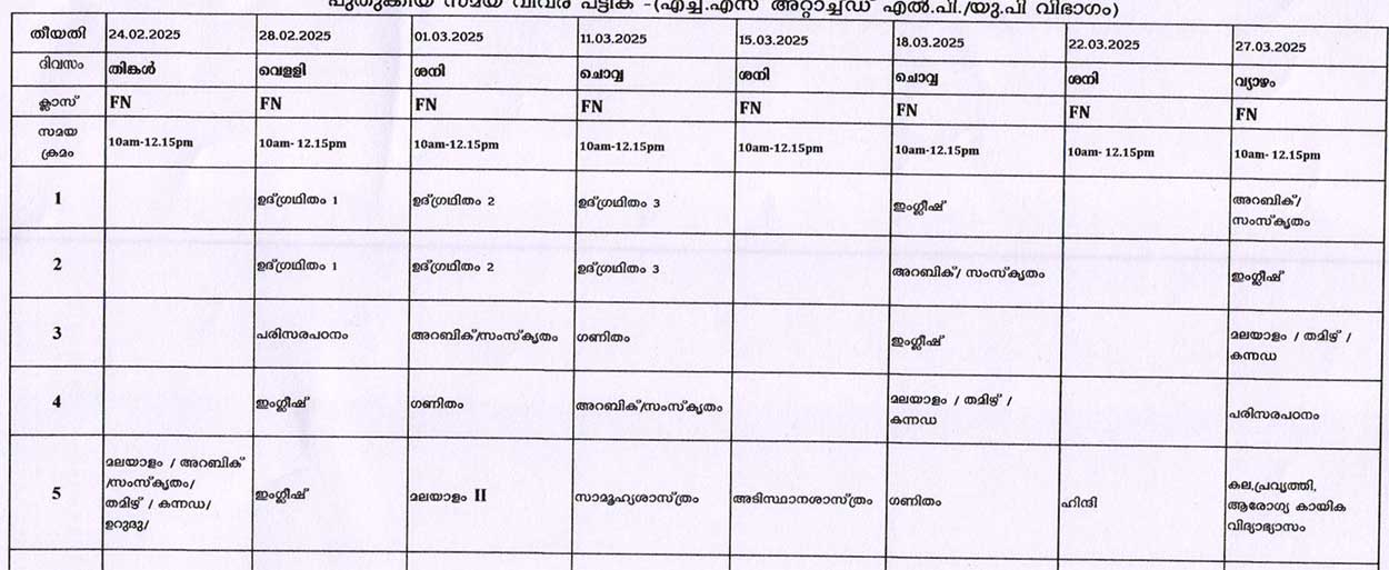 4. 27/02/2025 ന് രാവിലെ നടത്താൻ നിശ്ചയിച്ചിരുന്ന എച്ച്.എസ് അറ്റാച്ച്ഡ് യു.പി വിഭാഗംപരീക്ഷകൾ 24/02/2025 ന് രാവിലെ നടത്തുന്ന രീതിയിൽ പുന:ക്രമീകരിക്കുന്നു.