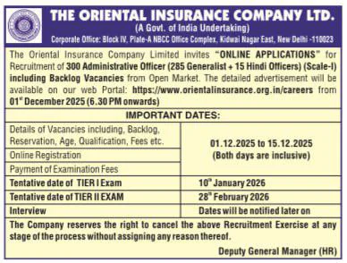 OICL is recruiting a total of 300 Administrative Officers (Scale-I), with 285 posts for Generalist Officers and 15 posts for Hindi (Rajbhasha) Officers, including backlog vacancies.