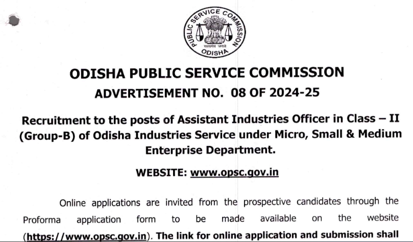 OPSC Issued notification for the Recruitment to the posts of Assistant Industries Officer in Class – II (Group-B) of Odisha Industries Service under Micro, Small & Medium Enterprise Department.