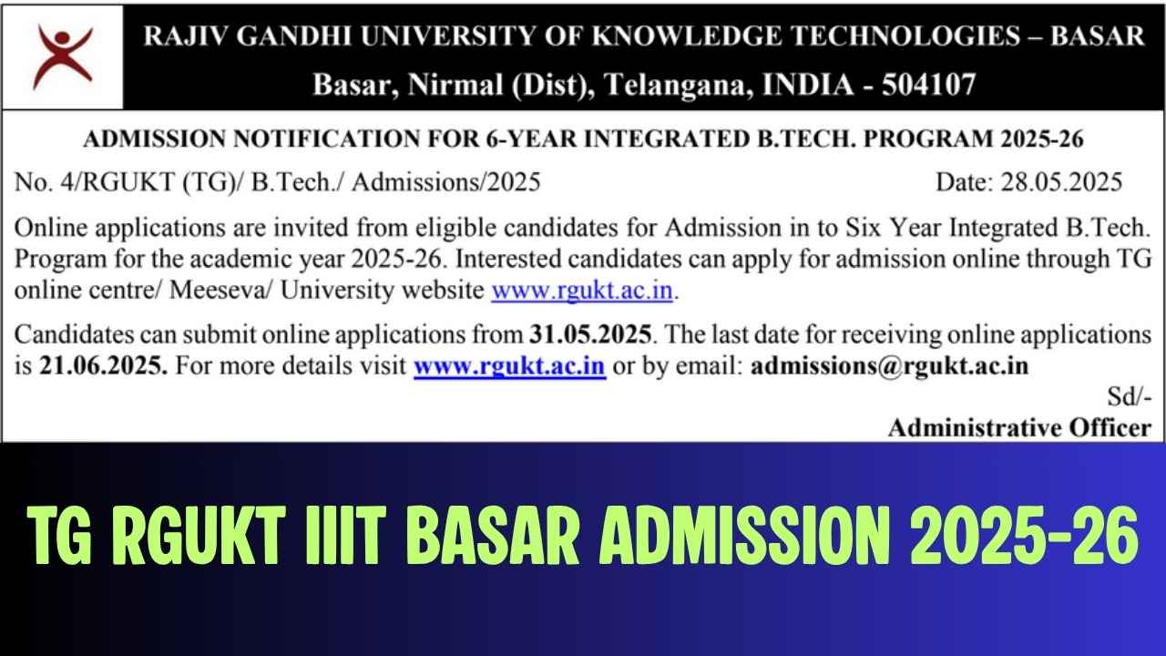 The notification for the Admissions to 6-Year Integrated B. Tech Program for the Academic Year 2025-26 in Rajiv Gandhi University of Knowledge Technologies (RGUKT)-Basar for the constituent institutes at Basar Campus (1500 Intake) and Mahabubnagar Campus (180 Intake) is released on 28.05.2025. The applications should be submitted through ONLINE MODE only TS online centre/ Meeseva/ University website www.rgukt.ac.in.