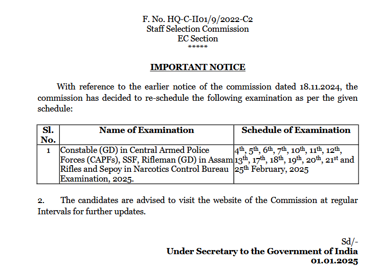 SSC Conducts GD Constable Examination on 4th, 5th, 6th, 7th, 10th, 11th, 12th, 13th, 17th, 18th, 19th, 20th, 21st and 25th February 2025 in four shifts in a Day.