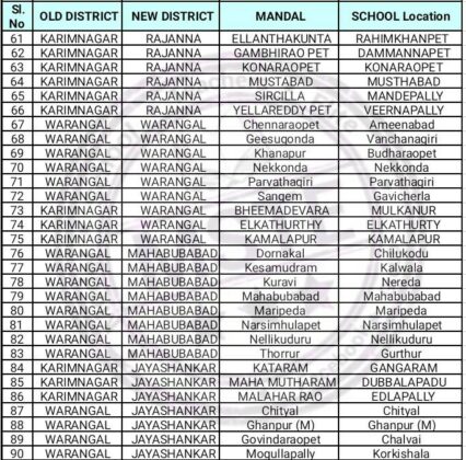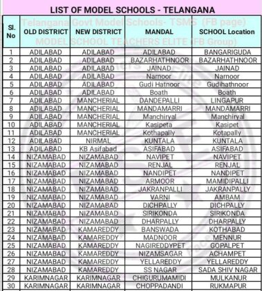 The list of Model Schools Mandal-wise in all Districts ( Except Hyderabad ) along with detailed Guidelines and Notification for Online Application Free of cost is available on the website http://telanganams.cgg.gov.in