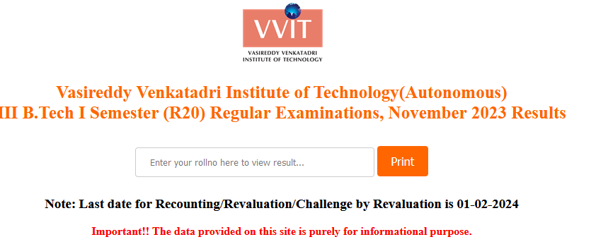 VVIT Results 2024: Vasireddy Venkatadri Institute of Technology (Autonomous) has released 3rd B.Tech I Semester (R20) Regular Examinations, Nov 2023 Results on 25th Jan 2023.